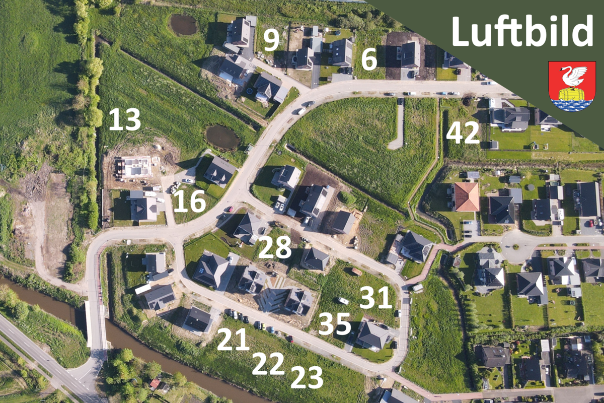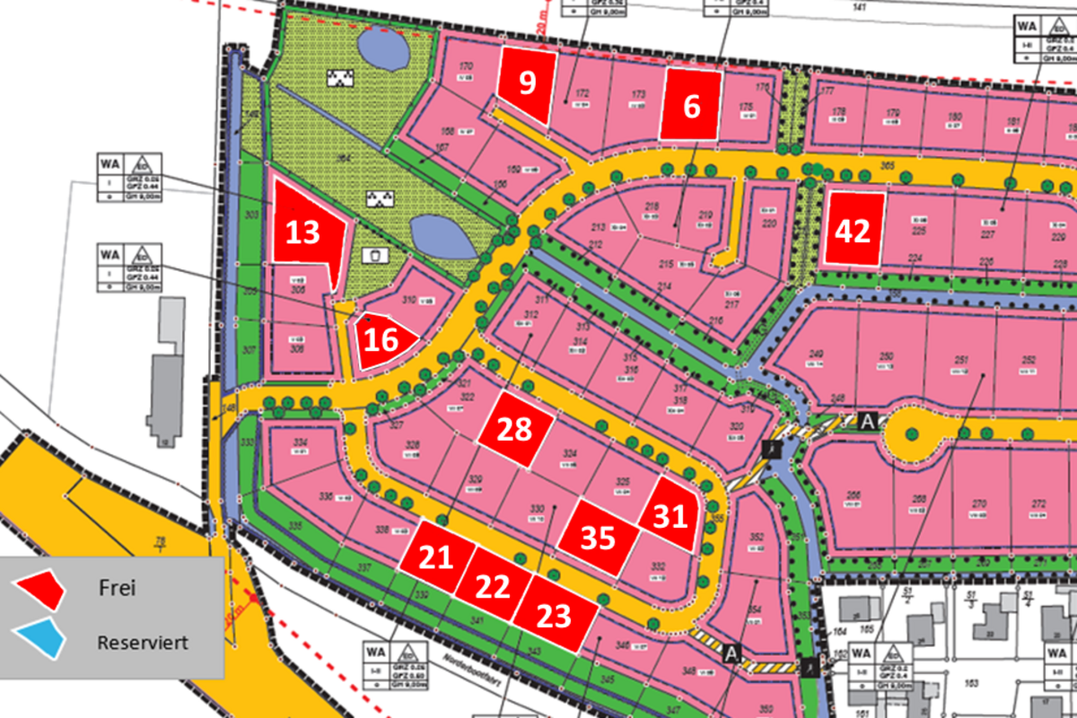 - Erschließung: Das Baugebiet wird in Abschnitten erschlossen. Die erste und zweite Teil-Erschließung sind bereits abgeschlossen und diese Grundstücke sind bereits verkauft. Der dritte Bauabschnitt mit rund 50 Grundstücken unterschiedlicher Bebaubarkeit befindet sich in der Endphase der Erschließung und parallel dazu beginnt die Vermarktung der Grundstücke.